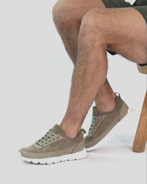 Herren-Sneaker. Velourleder Kaki. Schnürverschluss. Lederinnenfutter. Anatomisch herausnehmbare Innensohle. Leichte, flexible und robuste Sohle aus EVA. Absatzhöhe: 5 cm. 100% Hergestellt in Spanien.