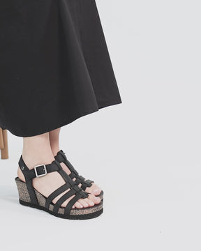 Keilsandalette. Geöltes Nappaleder in Schwarz. Klettverschluss. Lederinnenfutter. Anatomisch Innensohle. Leichte, flexible und robuste Sohle aus Kork und EVA. Absatzhöhe: 6.5 cm. 100% Hergestellt in Spanien.
